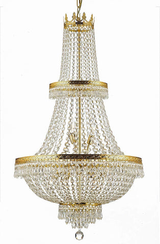Set of 2 - French Empire Crystal Chandelier Lighting H50" X W24" Good for Foyer, Entryway, Family Room, Living Room and More! This beautiful Chandelier is trimmed with Empress Crystal(TM) 100% CRYSTAL CHANDELIER, this chandelier is characteristic of the grand chandeliers which decorated the finest Chateaux and Palaces across Europe and reflects a time of class and elegance which is sure to lend a special atmosphere in every home. This item comes with 18 inches of chain. SIZE: W24" H50", 15 LIGHTS Assembly Required