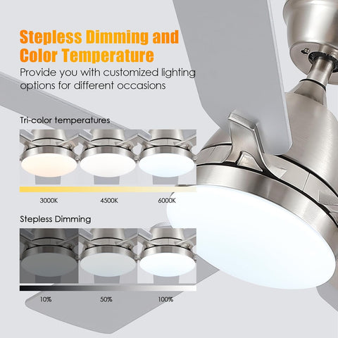 Ceiling Fans with Lights, 52 Inch Low Profile Ceiling Fan with Light and Remote Control,Reversible, 3CCT, Dimmable, Quiet, Brushed Nickel Ceiling Fan for Bedroom Indoor/Outdoor Use